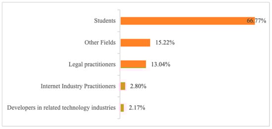 As illustrated in Figure 4, influenced by the thematic nature of the subject matter, its inherent sophistication and the composition of the research team, the majority (66.77%) of our respondents comprised college students. Individuals employed in the legal sector accounted for 13.04% of the surveyed population. The remaining participants represented a diverse and highly educated group, whose occupations were dispersed across a myriad of industries. These included, but were not limited to, the internet sector, the technology sectors, education, with teachers in higher education institutions, healthcare, environmental protection, transportation and animal health care, among others. Additionally, we received responses from a few retirees, contributing to a broader spectrum of perspectives and life experiences within our dataset.