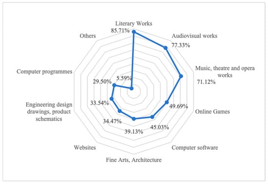 As illustrated in Figure 6, this question allowed for multiple responses, revealing a diverse range of copyrighted material regularly encountered by the public. Textual works emerged as the most prevalent, with an impressive 85.71% of respondents reporting frequent interactions with this genre. Music, theatrical works, variety shows, dance, acrobatic arts, cinematic works and similar cinematographic productions also registered high engagement rates, each exceeding 70%. Online games and computer software, both of which were accessed by more than 45% of the respondents were next in line. The fine art pieces, architectural designs and engineering diagrams available through websites also had a notable presence, with more than 30% of the respondents indicating exposure to these forms.