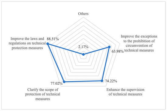 The public’s perspectives on the future development of copyright technical measures in China, as illustrated in Figure 8, highlight a near-consensus on the need for improvement. Close to 90% of respondents advocate for refining regulations concerning technical protection measures, emphasizing that the advancement of copyright technology measures is contingent upon a robust and comprehensive rule framework. Approximately 75% or more of the respondents called for increased oversight of these measures and clearer demarcation of their protective scope. Additionally, approximately 64% of the participants emphasized the exceptions of refinement, the prohibition of circumvention, suggesting a desire for balanced legislation that accounts for legitimate uses.