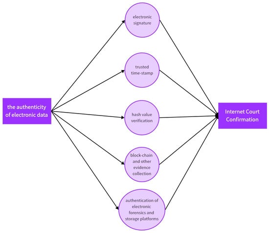 First, the formal authenticity and substantive authenticity of blockchain evidence need to be reviewed separately. The functional equivalence method can be used when substantive authenticity is reviewed. Accordingly, any blockchain evidence can be regarded as a legal and effective original if it is functionally equivalent or essentially equivalent to the effect of the original, and if the differences between upload nodes and backup nodes are no longer strictly distinguished. A piece of blockchain evidence can be deemed complete if it is not modified after the backup. Thus, the integrity and visibility of the information are taken as the criteria for judging the origin and can be used as the best evidence. To examine substantive authenticity, the focus is not only on investigating the reliability of the processes and methods involved in the formation, transmission, acceptance, storage and extraction of blockchain evidence but also on the possibility of tampering and whether the methods used in each link comply with the corresponding legal norms. In addition, the focus is on verifying the credibility, popularity and professional ability of the source subject of the evidence and clarifies whether there is an interest relationship between the submitter of blockchain evidence and its source subject. For example, in the case where Huagai Creative (Beijing) Image Technology Co., Ltd. sued Rongxin (Fujian) Investment Group Co., Ltd. for copyright infringement [25], the Fujian High Court determined that Huagai’s evidence collection operation was completely carried out on its own computers and that the relevant functions of the timestamp service center were used only for uploading. Therefore, the authentication behavior was aimed only at the time of uploading, not at the file itself. Moreover, since the source and operation process of the documents were unilaterally controlled and operated by Huagai, and there was a lack of effective supervision by a third party, ensuring the objectivity, impartiality and legitimacy of the documents was impossible, which is why the court did not approve. Accordingly, the whole process, from the generation and transmission of blockchain evidence to its use in a court, requires the participation of reputable subjects and reliable technical support.