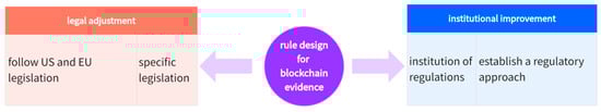 Specifically, it can start from two aspects: legal adjustment, i.e., the establishment of administrative supervision institutions, and the construction of their systems (see Figure 10). First, following the legislation in the United States and the European Union, China should simply provide the technical definition of a blockchain, clearly define the legal meaning and status of a blockchain and smart contract, uniformly supervise blockchain applications and smart contracts, and clarify the responsible subject, imputation principle and relief measures of a blockchain platform [24]. In specific legislation, China should pay attention to the characteristics of blockchain technology; issue specific laws, regulations and supporting systems; specify the data, technology and platforms of blockchain technology; and revise the lagging laws and regulations, such as the relevant examination standards related to blockchain electronic data storage in the Civil Procedure Law. With respect to the administrative governance systems, regulations governing blockchain copyright applications should be formulated to clearly define foundational concepts such as blockchain copyright platforms and services, delineate the service providers of blockchain copyright platforms and set industry entry barriers, stipulate legal responsibilities and remedial measures for blockchain copyright platforms, penalize transgressions by blockchain copyright platforms to regulate their oversight, devise supervisory methodologies for blockchain copyright platforms’ data collection and management that align with blockchain technology characteristics, meet legal requirements for safeguarding data subjects’ rights, and enabling effective blockchain copyright platform supervision, all of which contribute to a developed legal ecosystem for blockchain applications.