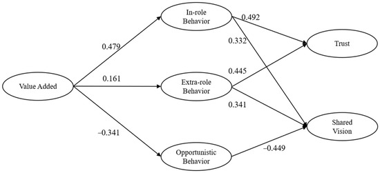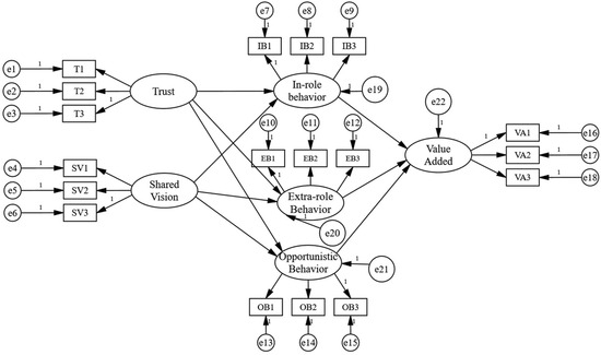 These hypotheses form a cognition–behavior–value chain model. In this context, we have examined the effects of inter-organizational relationship cognition on value added, extending this chain by incorporating various dimensions of inter-organizational relationship cognition and three distinct types of organizational behavior. Accordingly, these hypotheses support the initial connections within this chain. Taking into consideration the above hypotheses, the SEM model was constructed as shown in Figure 1 in this study.