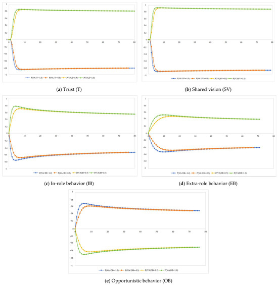 As shown in Figure 3b, shared vision has significant facilitating effects on the value added. The initial state value of 1 (or −1) for shared vision resulted in a higher (or lower) level of value added compared to a value of 0.5 (or −0.5). However, the magnitude of the increase (or decrease) was insignificant. If shared vision and value added were initially 1 (or −1), there would be a higher (or lower) level of value added than if they were initially 0.5 (or −0.5), which would indicate a substantial change in the value added. These results show that when the intervention of shared vision is insufficient, the value-added effect is not much different from the effect of no intervention, indicating that the intervention effect is poor, which means that the most effective and cost-effective intervention would be to raise the level of shared vision to 0.5.