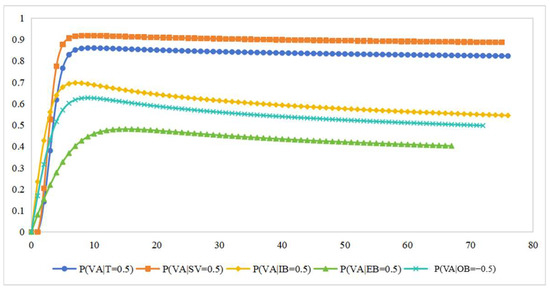 Based on the above analysis, moderate interventions in project participants’ cognitions, as well as behaviors (i.e., T = 0.5, SV = 0.5, IB = 0.5, EB = 0.5, and OB = −0.5), can effectively contribute to the engineering project value addition. For further comparison, T = 0.5, SV = 0.5, IB = 0.5, EB = 0.5, OB = −0.5, and simulation analysis are conducted. Figure 4 illustrates the results. Clearly, moderate interventions on shared vision and trust enhance value-added effects significantly. When the FCM model moves to a steady state, P(VA|EB = 0.5) < P(VA|OB = −0.5) < P(VA|IB = 0.5) < P(VA|T = 0.5) < P(VA|SV = 0.5). Therefore, among the five influencing factors in this study, trust and shared vision are the most critical influencing factors, and addressing these two aspects through appropriate interventions can effectively add value to the project. In-role behaviors, opportunistic behaviors, and extra-role behaviors are the next most important influencing factors, and moderate interventions can contribute to value addition to some extent.