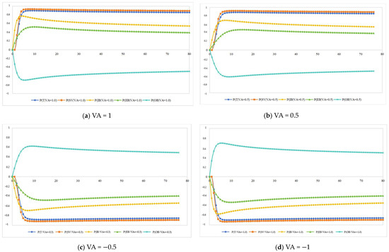 Impacts of variations in value added on the influencing variables V (V = T, SV, IB, EB or OB) when value added (VA) is set to be: (a) VA = 1; (b) VA = 0.5; (c) VA = −0.5; (d) VA = −1.