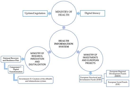 We believe that for the effective implementation of a health information system (HIS) in Romania, the synchronization and harmonization of the actions of the following institutions is crucial, as presented in Figure 1.