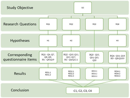 The study was structured following a linear flow, as seen in Figure 2: study objective, research questions, hypotheses, a demonstration intended to support the research questions, questionnaire items corresponding to each question and hypothesis, results, and conclusions.