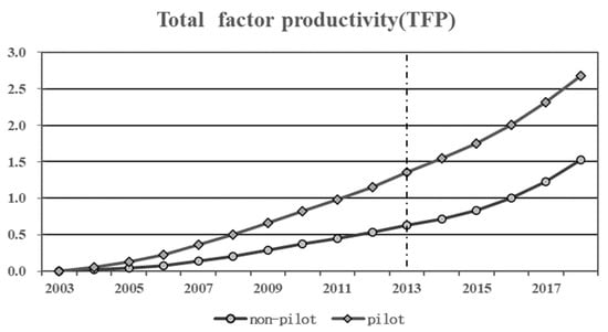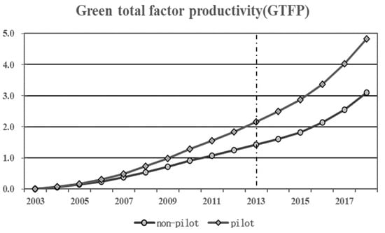 To investigate whether government digital transformation influences urban economic development, this paper conducted a preliminary descriptive statistical analysis of TFP and GTFP in pilot cities and non-pilot cities affected by this policy. As shown in Figure 1 and Figure 2, it is evident that during the Eleventh Five-Year Plan period, the level and quality of China’s socio-economic development showed an upward trend, and disparities between pilot and non-pilot cities began to emerge. During the Twelfth Five-Year Plan period, with the strengthening of e-government foundations, urban economic development exhibited significant growth in level and quality. After 2013, pilot cities showed a notably higher growth rate in TFP and GTFP compared to non-pilot cities, leading to an expanding gap in development level and quality. This indicates that the construction of e-government public platforms in pilot cities has successfully facilitated government digital transformation, enhanced governance capabilities, facilitated the smooth flow of various production factors within industries, sectors, and across regions, and promoted green and innovative development. These findings support the theoretical hypothesis of this study.