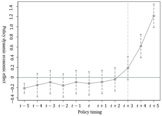 A necessary condition for regression estimation using a double difference model is the fulfillment of the parallel trend assumption. Before the policy implementation, it is crucial that the experimental and control groups exhibit similar tendencies of change. One year before the policy of e-government platform construction and application was introduced, a reference group was used to verify the existence of parallel trends in the observation sample through the event study method []. Figure 3 depicts the regression results for the core explanatory variable and its corresponding 90% confidence interval, and it is evident that the coefficient of regression is not significant from period to , indicating that before the pilot policy’s implementation, there was no significant difference in the economic development quality between the experimental and the control groups, satisfying the parallel trend assumption. Furthermore, since the commencement of the period, there has been a marked increase in the significance of the estimated coefficient , indicating that government digital transformation has a driving effect on the high-quality development of urban economy with an approximate lag period of three years. Moreover, this promotional effect is enduring.