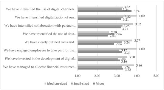 Figure 2 presents the mean values representing the level of agreement among participating enterprises based on a 5-point Likert scale, where 1 indicates “strongly disagree” and 5 indicates “strongly agree”. It suggests that small- and medium-sized enterprises were generally better engaged in digital transformation compared to micro enterprises with the exception of digital transformation activities related to the use of digital channels for marketing and the use of data management tools. Based on the ANOVA results, significant differences between three groups of MSMEs at the p < 0.05 were found for three digital transformation activities: “We have intensified digitalization of our internal core processes” (F(2,65) = 5.15, p = 0.008), “We have clearly defined roles and responsibilities for digital initiatives” (F(2,65) = 4.04, p = 0.022), “We have engaged employees to take part for the digital transformation” (F(2,63) = 4.91, p = 0.010). The results of the multiple comparison test show that there are statistically significant differences in average agreement with the statement “We have intensified digitalization of our internal core processes” between micro and medium-sized enterprises (p = 0.019) and small- and medium-sized enterprises” (p = 0.034), while with the statement “We have clearly defined roles and responsibilities for digital initiatives”, only between micro and medium-sized enterprises (p = 0.007). Furthermore, there are statistically significant differences in average agreement with the statement “We have engaged employees to take part for the digital transformation” between small- and medium-sized enterprises (p = 0.026). Table 8 shows how MSMEs have approached various aspects of digitalisation, such as marketing, internal processes, collaboration with partners, data management, and employee engagement. To facilitate comparison with qualitative findings, we converted a 5-point Likert scale to three categories in order to obtain three levels of engagement: non-action, routine action, and intensified action. This helped us to highlight the digital maturity gap between micro, small-, and medium-sized enterprises, with the latter being more advanced in most aspects of digital transformation.
