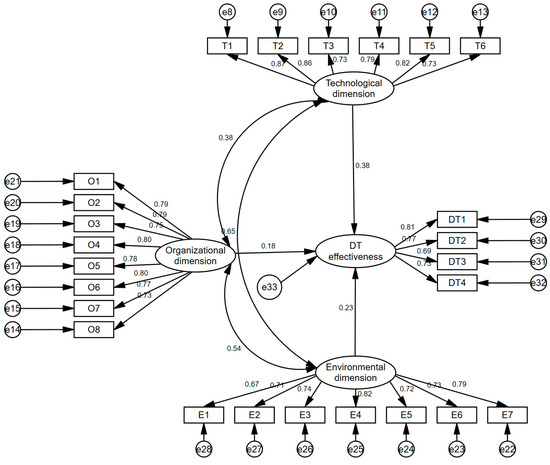 According to Table 9, the standardized path coefficients of the three dimensions of the DT effectiveness are 0.38 (t =4.761, p = 0.000 < 0.001), 0.182 (t = 2.646, p = 0.008 < 0.01), and 0.227 (t = 2.579, p = 0.01 < 0.05), respectively. It indicates that the technological, organizational, and environmental dimensions significantly impact the DT effectiveness, confirming the three hypotheses’ validity.