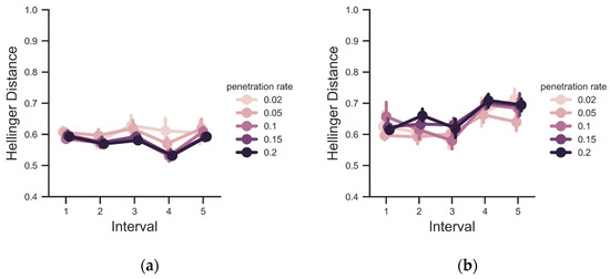 Five simulations are conducted with the baseline signal plan and different random seeds to provide historical data for QST estimation. Five penetration rates of connected vehicles (i.e., 0.02, 0.05, 0.1, 0.15, and 0.2) are considered to investigate their impacts. At each penetration rate, the estimation is repetitively conducted 10 times to produce sufficient results. The ground truth of QST is recorded according to the criterion described in Section 2.1. Since the output of the proposed model is the posterior distribution of QST, we adopt the Hellinger distance to evaluate the estimation results. In statistics, the Helligner distance is designed to measure the similarity between two distributions, which is regarded as a probabilistic analog of the Euclidean distance. According to Equation (8), the Hellinger distance can be calculated as follows: