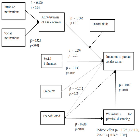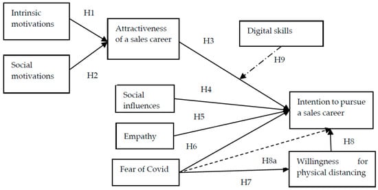 This study examines the factors that lead students to consider or avoid a career in sales, focusing on behaviors and preferences during the transition period following the peak of the COVID-19 pandemic. Conducted in 2021, the study captures how the pandemic has changed traditional aspects of sales work, such as face-to-face interaction, and explores the lasting impact of these changes on young professionals. A sample of 671 business and engineering students participated in an online survey; data analysis was performed by using Partial Least Squares Structural Equation Modeling (SEM-PLS). Results show that intrinsic and social motivations enhance the perceived attractiveness of a sales career, which, in turn, impacts career intentions. Although empathy and COVID-19-related fears lack a direct effect on the intention to pursue a sales career, digital skills reinforce the connection between job attractiveness and career intentions in a digital-centric environment, having a moderating role. These findings emphasize the evolving nature of sales careers, highlighting the need to align career development strategies with young people’s intrinsic motivation and digital competencies. This study adds to the understanding of motivational factors in sales career decisions and offers valuable insights for employers seeking to attract motivated talent in a shifting industry landscape.