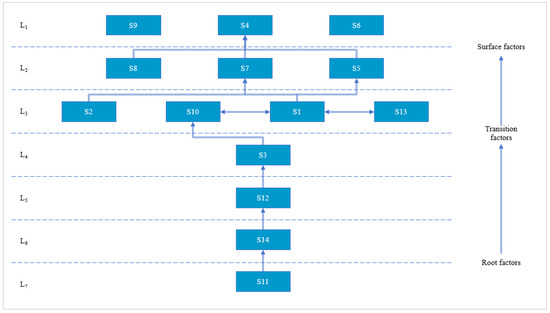 When a factor satisfies , it indicates that is the top-level factor. Remove the row and column corresponding to factor in the reachability matrix , recalculate the reachability set, antecedent set, and intersection, and continue this process to identify the next level until all factors are classified, forming the final factor hierarchy.
