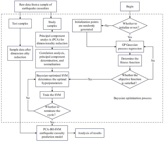 Figure 2 illustrates the modeling process for predicting earthquake casualties based on PCA-BO-SVM. The relevant steps are as follows: