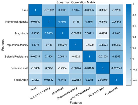 This study employed Principal Component Analysis (PCA) to conduct a correlation analysis and dimensionality reduction on seven influencing factors: time, earthquake intensity, occurrence time, magnitude, population density in disaster areas, seismic resistance of buildings, earthquake prediction capability, and focal depth. The results of this processing are illustrated in Figure 3, where the correlation coefficient heatmap uses color intensity to represent the magnitude of the correlation coefficients. Darker colors indicate stronger correlations, while lighter colors indicate weaker correlations. This visualization allows for an intuitive assessment of which variables exhibit strong correlations, thereby facilitating further analysis of the relationships and influences between the variables.