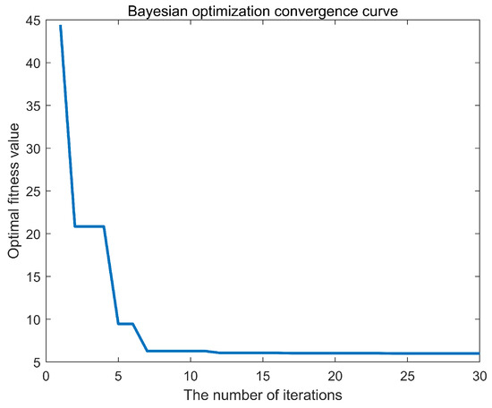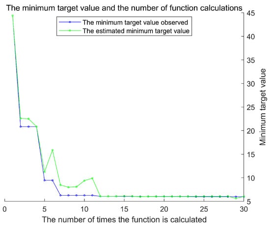 To obtain the optimal hyperparameters for the Support Vector Machine (SVM), this study implemented a program based on the Bayesian Optimization Support Vector Machine using MATLAB R2020b. The number of earthquake casualties was designated as the output variable, while the four principal components listed in Table 3 served as the input variables. After extensive training, the optimal fitness curve was achieved, as illustrated in Figure 6. The minimum objective value and the number of function evaluations are shown in Figure 7. Additionally, the Bayesian Optimization process took 17.42 s to identify the best hyperparameters, demonstrating a high level of operational efficiency.