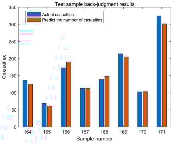 Using the constructed PCA-BO-SVM model, we performed predictions and validations on the test samples, and the results are presented in Figure 8. As shown in the results depicted in Figure 8, by comparing with historical data, it can be seen that there is not much difference between the predicted casualty and the actual casualty number, indicating that the PCA-BO-SVM model can effectively capture the key factors that affect the casualty number when processing the data. The average accuracy of the prediction results is 94.25%, which shows the accuracy of the prediction of the proposed model, and it can be seen that the prediction model based on Principal Component Analysis and Bayesian Optimization Support Vector Machine (PCA-BO-SVM) has a high consistency with the actual value.