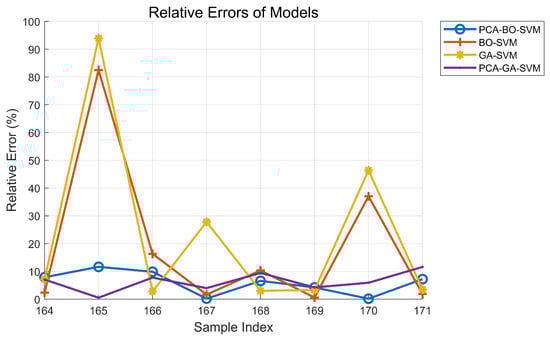 The relative errors of the prediction results from the four models are illustrated in Figure 9. According to the relative errors of the predictions from various models presented in Figure 9, the PCA-BO-SVM model demonstrates the best performance. Without conducting Principal Component Analysis, both the GA-SVM and BO-SVM models exhibit relatively large errors, while the results of the BO-SVM model outperform those of the GA-SVM model. This indicates that the Bayesian Optimization Support Vector Machine (BO-SVM) is more effective than the Genetic Algorithm (GA) in this context. It is evident that the BO-SVM has superior convergence and robustness when handling high-dimensional data and complex optimization problems, allowing it to find the global optimum more rapidly. Moreover, it performs exceptionally well in managing noisy data and non-convex optimization issues, making it well suited for practical applications. Figure 9 illustrates the significant improvement in performance resulting from dimensionality reduction through principal component analysis, leading to better data analysis.