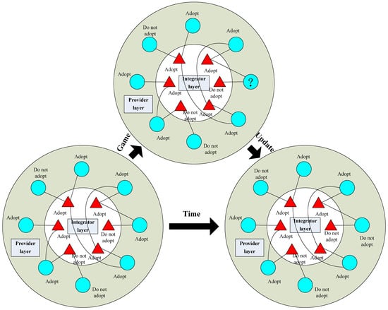 As illustrated in Figure 2, the regional logistics service supply chain network in a blockchain environment leverages the benefit appreciation of the “provider–integrator” node as its driving force, continually evolving and converging toward the Pareto optimal state of the network system. Within the framework of complex networks, the popularity of blockchain technology has emerged as a critical criterion for assessing the breadth and depth of network evolution. Consequently, this study adopts the technology adoption rate (i.e., the total ratio of blockchain technology selected by system participants) as an effective index for measuring the state of the network game.