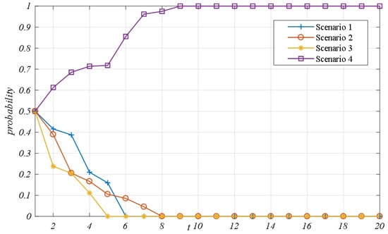 According to the Lyapunov stability analysis method, an equilibrium point is considered a partial stability point of the evolutionary game system if, and only if, all eigenvalues of the Jacobian matrix are negative. Five partial equilibrium points are then substituted into the Jacobian matrix of the system for stability analysis. Among these, four equilibrium points—, , , and —meet the requirements of the evolutionary stability strategy, while one equilibrium point, , does not qualify as an evolutionary stability strategy of the game system. After discussing the stability of the classified evolutionary game system, the following four different scenarios will be examined: