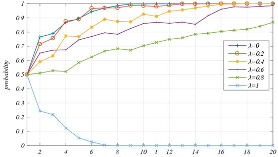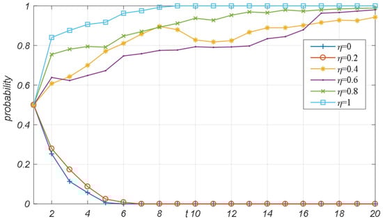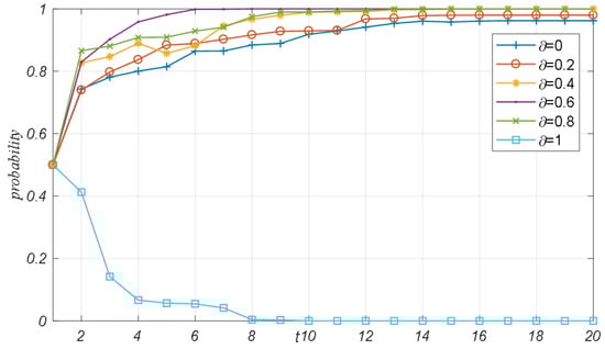 and are the game strategies of the former stage and the latter stage of the network game players, respectively, while and denote the game income from the previous stage and the expected income for the upcoming stage. represents the noise of the evolutionary game system; when , it indicates that system disturbances have a minimal impact on the strategies of the network game participants, and when , it suggests that system disturbances become a critical factor influencing the strategies of the network game participants.