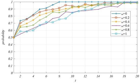 Figure 6 and Figure 7 present the simulation results illustrating the impact of changes in the elasticity coefficient concerning the quality of basic demand in the logistics service market on the evolutionary game dynamics within the regional logistics service supply chain complex network. According to the network evolution trend depicted in Figure 6, as the quality elasticity coefficient increases, the technology adoption rate gradually transitions from converging to 0 to converging to 1. Specifically, when or , the adoption rate ultimately converges to 0. When , the adoption rate converges to 0.7672. When , the adoption rate converges to 0.9275. Finally, when , the adoption rate converges to 1. This indicates that a higher quality elasticity coefficient, , corresponds to a higher convergence rate of the technology adoption rate.