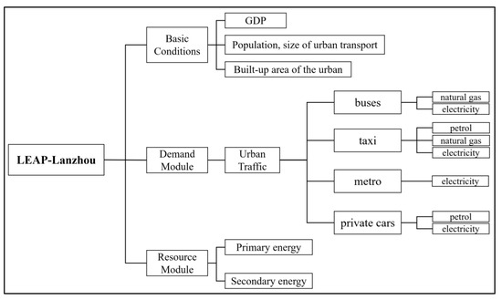 The Demand Module models the dynamic energy demands of different sectors (e.g., industrial, transport, and buildings), typically based on historical data and assumptions regarding economic and societal development. It is a prerequisite for carbon emission prediction. This component of the LEAP-Lanzhou model focuses exclusively on urban transportation. The model categorizes urban transportation into three hierarchical levels but excludes certain vehicle types that are less prevalent in urban settings.