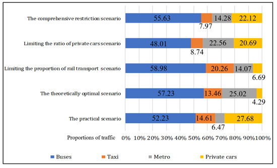 Based on the aforementioned scenario with additional constraints, we define a new optimization configuration by simultaneously limiting the lower bound of the private car proportion and the upper bound of the subway proportion, which is referred to as the “comprehensive restriction scheme”.