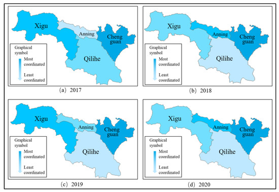 The analysis incorporates data from Lanzhou, which spans urban areas, townships, and suburban regions. In optimizing the urban transportation structure, a greater emphasis should be placed on urban areas to alleviate traffic congestion and reduce environmental impacts in densely populated zones. The same coordination evaluation method and indices are thus applied to assess green transportation coordination in the four urban districts of Lanzhou—Chengguan, Qilihe, Anning, and Xigu—under the baseline scenario. The findings from this evaluation are presented in Figure 4 and Figure 5.