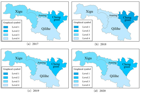Figure 5 illustrates the levels of green transportation coordination across the four districts. Although the coordination levels of the districts are ranked, districts with small differences in coordination are still categorized within the same level. From Figure 5, we can conclude Qilihe and Anning Districts are adjacent to Chengguan District, and a significant amount of travel demand is reflected in inter-district travel among the three areas, especially during morning and evening commutes. If slow traffic is obstructed or the allowed traffic volume is less than the actual demand, it will greatly increase the time residents spend waiting on roads and at stations, leading to a higher occupancy rate of traffic resources. Although the total number of taxis and ride-hailing vehicles is relatively reasonable, there are instances during peak hours and inclement weather when it becomes difficult to find a vehicle. With the opening of Metro Line 1 in June 2019, residents now have a new travel option between Chengguan, Qilihe, and Anning Districts, which has slightly alleviated the aforementioned issues, but there is still room for optimization.