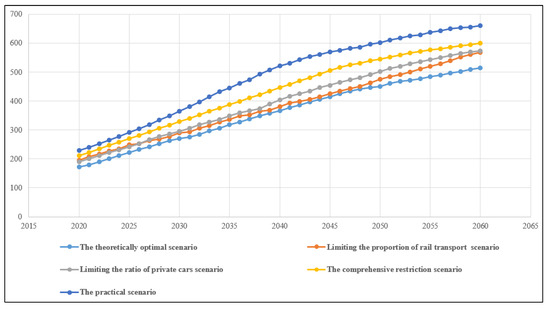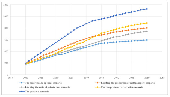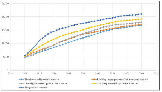Based on the calculated energy consumption levels presented in Figure 6 under various scenarios, it can be concluded that each optimization scenario reduces the energy consumption of urban transportation. However, the upward trend of energy consumption over time remains unchanged. Between 2040 and 2045, the growth rate of energy consumption will slow down across all scenarios. Nonetheless, except for the theoretically optimal scenario, the energy consumption levels of other scenarios will continue to rise significantly after 2045, failing to meet the target requirement for energy savings to reach a peak.