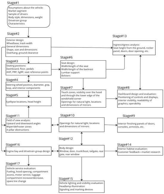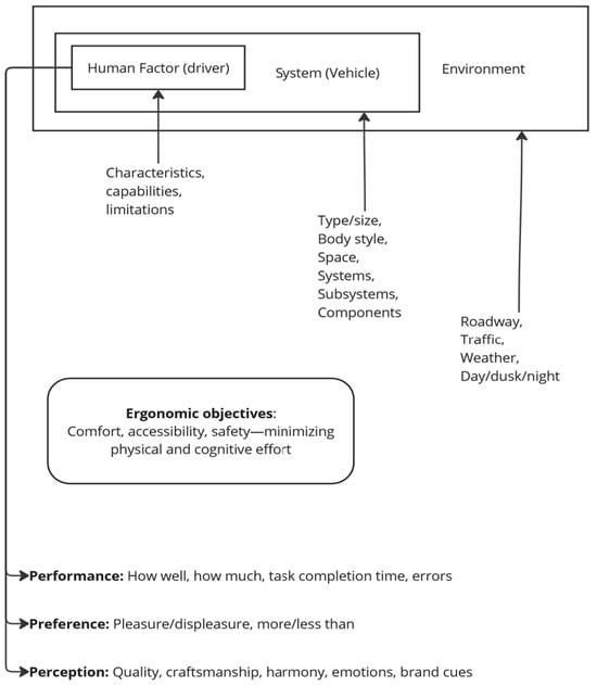A significant issue in the ergonomic design of vehicles is the conceptualization of “humans as part of the system”, where the designer treats the human factor as an integral part of the system to be developed. This mode of analysis requires a comprehensive approach to the driver/user, vehicle, and surrounding environment during the design process. By incorporating the characteristics of each component of the system, including the human user, designers ensure that the vehicle meets user needs related to comfort, accessibility, and safety. Moreover, understanding the human–machine relationship and the vehicle’s operating environment is crucial in the design process, ensuring that the system efficiently responds to user requirements during various tasks, preferences, and perceptions in diverse operating conditions. In this regard, an important conceptualization was made by researcher V.D. Bhise in 2011 [], who proposed a model for optimizing vehicle design, which can be visualized in Figure 1. The diagram for evaluating vehicle interior ergonomics, conceptualized by the same researcher, is represented in Figure 2.