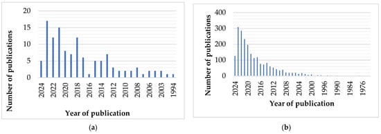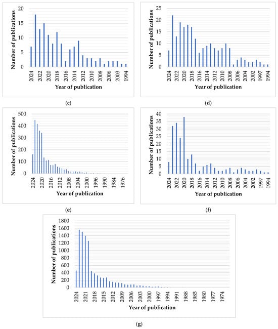Analyzing the presented data, there is an increasing trend in research on ergonomics, comfort, and human factors engineering (Figure 4a–g) applied to vehicles, with particular emphasis in recent years. A peak interest in 2023, with 14% of the total analyzed publications, indicates heightened interest and focus on innovations and optimizations in these fields. The year 2024, with 4% of the total publications, suggests that interest in the field remains significant, although this figure may only partially reflect the year’s research activity. The intermittency observed in the number of publications from previous years may reflect fluctuations in research funding allocation, changes in technological trends, and adaptation to market demands. However, since the early 2010s, there has been a general upward trend, except for 2016, which shows a temporary decrease in interest. These data may indicate that ergonomic comfort research in vehicles aligns with technological evolution and changing societal requirements, stimulated by the development of emerging automotive technologies such as autonomous vehicles.
