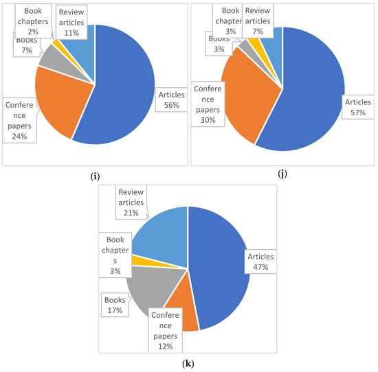 Distribution of publication types across reference groups in automotive ergonomics literature. (a) Ergonomics. (b) Human Factors Engineering. (c) Comfort. (d) Ergonomics and Comfort. (e) Ergonomics and Human Factors Engineering. (f) Comfort and Human Factors Engineering. (g) Comfort, Ergonomics and Human Factors Engineering. (h) Thermal Comfort. (i) Vibrational Comfort. (j) Acoustic Comfort. (k) Acoustic, Vibrational, and Thermal Comfort.