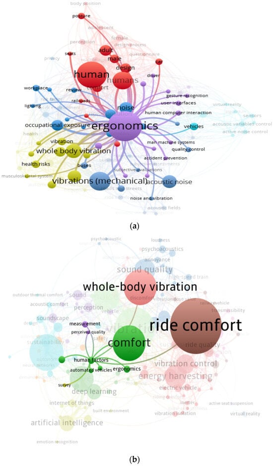 A bibliometric analysis was conducted to investigate the key terms of the most cited papers according to group (all 10 groups were analyzed—Table 3). The results are systematically represented in Figure 7 and Figure 8. A minimum of 10 keyword occurrences were considered for the current analysis to map all keywords from the specialized literature regarding ergonomics, human factors engineering, and comfort, with the three dimensions: thermal, vibrational, and acoustic, applied to vehicles. For Reference Group 1 (Figure 7a)—the total number of keywords reached 8853, with only 3826 words meeting the preliminary selection criteria. All selected keywords were represented in five groups with 247 links and a total link strength of 141,537. For Reference Group 2 (Figure 7b)—the total number of keywords reached 29,444, with only 7841 words meeting the preliminary selection criteria. All selected keywords were represented in nine groups with 112 links and a total link strength of 3778. For Reference Group 3 (Figure 7c)—the total number of keywords reached 21,675, with only 7246 words meeting the preliminary selection criteria. All selected keywords were represented in nine groups with 157 links and a total link strength of 6340. The size of the node is proportional to the number of occurrences (frequency) and the link strength of a keyword in the analyzed database.