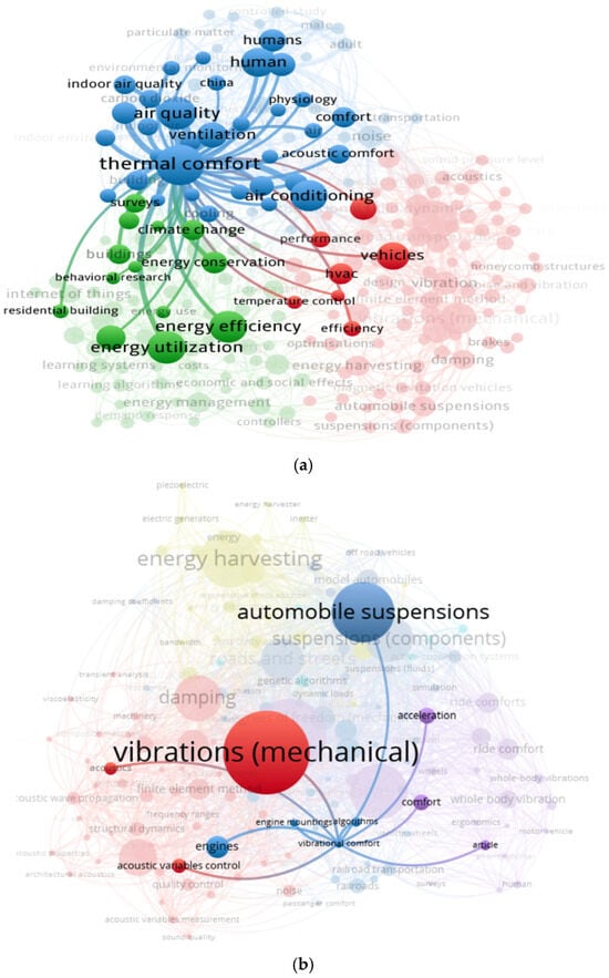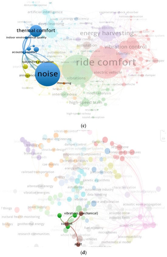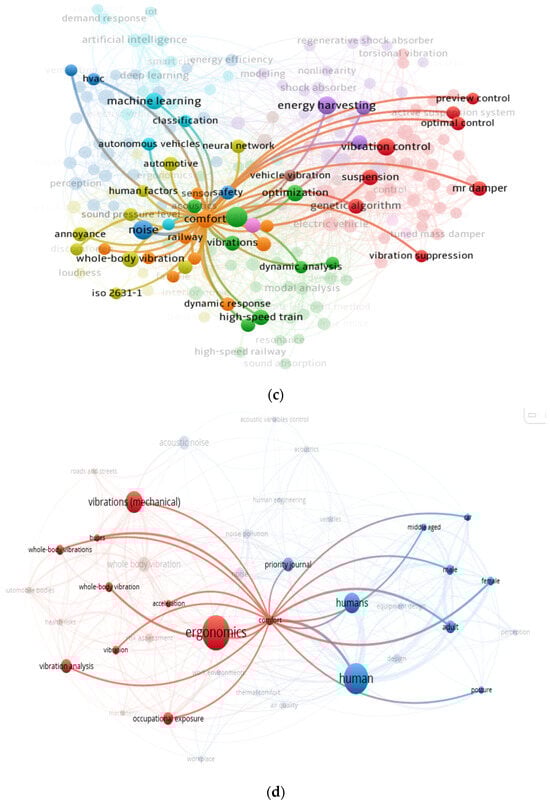 Bibliometric analysis of keywords and top cited authors for research on thermal, vibrational, and acoustic comfort in vehicles. Source: Scopus, Web of Science. (a) Thermal comfort. (b) Vibrational comfort. (c) Acoustic comfort. (d) Thermal, Vibrational, and Acoustic comfort.