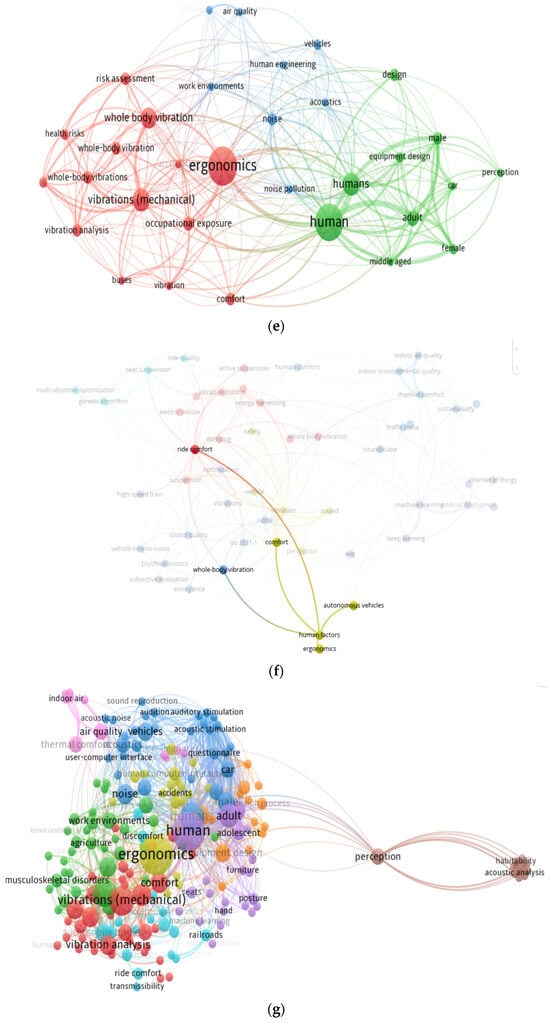 The evolution of research in automotive ergonomics (Figure 4f) is characterized by an evolutionary trajectory in which academic activity has shown fluctuating dynamics, with increased interest observable in recent years. In 2023, there is a notable rise, signifying a growing recognition of ergonomics as a key element in vehicle design. This can be attributed to the automotive industry’s increased attention to user safety, comfort, and efficiency. In contrast, the pre-2010 period reflects a more tempered approach to ergonomic research, with a relatively low number of academic contributions. However, the sustained growth trend after this period suggests a progressively important role in optimizing user interfaces and adapting vehicles to human factors needs in the context of technological advancements and emerging ecological and social requirements.
