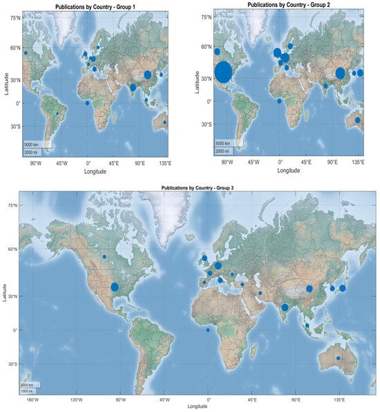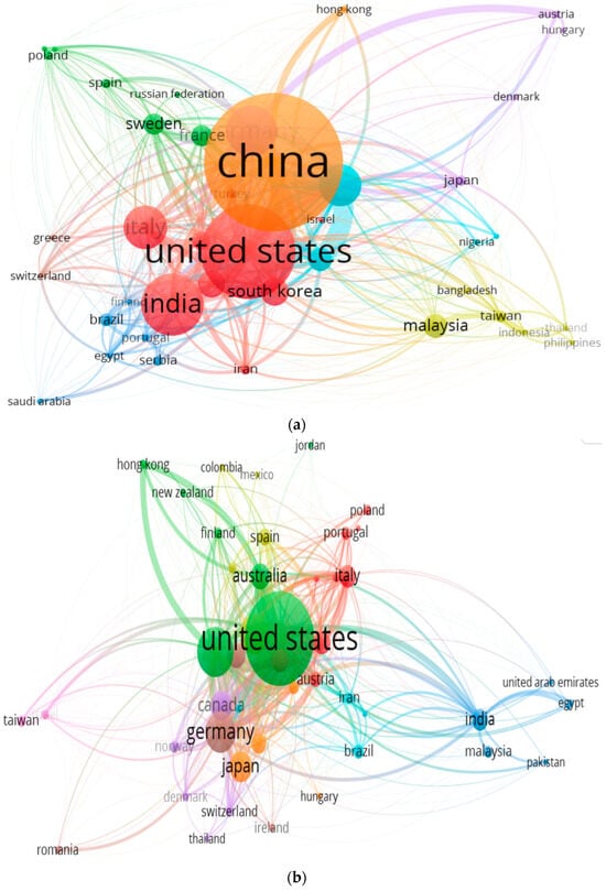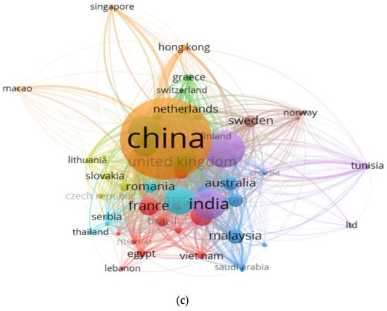 The analysis of contributing countries for the collected sources is represented in Figure 9. The co-citation analysis of countries (Figure 10) identifies the nations that have contributed to the research in the referenced domains analyzed. The size of the nodes is proportional to the number of publications, and the thickness of the line connecting the countries represents the strength of research collaboration.