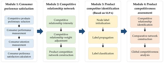 This research focuses on the consumer’s selection and evaluation processes during purchase decisions, wherein each consumer endeavors to acquire the product that maximizes personal satisfaction. To establish a competitive intelligence analysis model for products, we introduce the PCAM-CPSS. The framework of the PCAM-CPSS is depicted in Figure 1, comprising four modules. Through the analysis of target products’ competition, we constructed a competitive relationship network that includes the target products and their potential competitors, providing valuable insights into product positioning and market strategies.