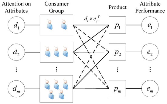 During the consumer decision-making process, consumers assess different products by considering their attention and perception of product attributes [54]. The weight assigned to each product attribute is determined by consumers’ attention. The overall satisfaction of similar consumer preference with each product is measured by the product of attribute attention vector and attribute performance vector :