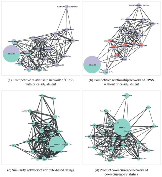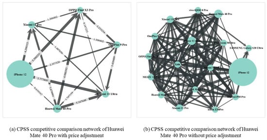 As depicted in Figure 3a, the competitive market delineates a cluster comprising Apple iPhone 12, Huawei Mate 40 Pro, One Plus 9 Pro, Xiaomi 11 Ultra, Xiaomi 11 Pro, and OPPO Find X3 Pro, manifesting notably proximate competitive interrelations. This intricate web of competitive relationships necessitates a meticulous quantitative assessment, employing Formula (6) to gauge the strength of comparative competitiveness among these products. This assessment takes into account the weighted disparities that underscore the products’ varying degrees of alignment with the manifold needs of diverse consumer segments. Subsequently, underpinned by the discerned comparative competitiveness relationships and their respective magnitudes, we constructed the PCAM-CPSS product competitiveness comparison network. In the denouement, we invoked the weighted PageRank algorithm to derive a comprehensive evaluation of each product’s global competitiveness within this competitive market, leading to the ordered ranking. In contrast, the PCAM-CPSS method without price adjustment stands out solely due to its omission of price-related factors. The comparative competitive network generated by both methods is depicted in Figure 4. The comprehensive evaluation of products within the competitive market encompassing Huawei Mate 40 Pro is detailed in Table 4.