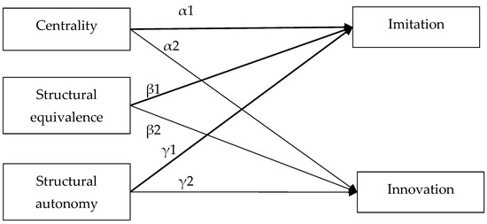 Second, the literature has struggled to differentiate between imitation and innovation [1], resulting in a lack of predictive power when examining executives’ assessments of new venture strategies. We posit this primarily because imitation and innovation are not mutually exclusive choices, and their similarities often outweigh their differences. Both approaches involve recombining existing information and resources, with the primary difference being the degree of novelty [9]. Consequently, the factors influencing imitation often have similar effects on innovation. In previous studies, scholars typically assumed that firms in key network positions, especially those with extensive connections, are equally likely to pursue innovation and imitation. However, executives exhibit clear preferences in practical scenarios and adhere to distinct strategic orientations [10]. Therefore, it is crucial to explore how different dimensions of network position influence executives’ preferences for imitation or innovation when making new venture decisions.