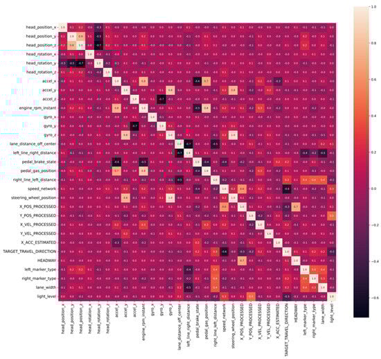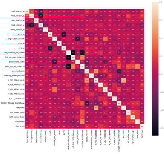 To avoid wasting computing power due to high correlation among metrics, it is crucial to perform correlation analysis and eliminate indicators with significant redundancy. Initially, the linear correlation between features is evaluated using the Pearson correlation coefficient method in Python. The selection process continues for driver parameters, vehicle parameters, road parameters, and environmental parameters from the initial screening, with the results depicted in Figure 1. Notably, there are eight indicators that exhibit a correlation coefficient of 0.8 or higher with other indicators. Furthermore, the nonlinear correlation of each index is assessed using the Spearman correlation coefficient method, as shown in Figure 2. The results indicate a strong nonlinear correlation between the index LDOC and the index LLRD. To refine the selection, the information entropy of the highly correlated indices is calculated. Based on the principle of information entropy retention, six indicators are re-screened: head_position_y, accel_x, gyro_z, accel_y, pedal_gas_position, and left_line_right_distance. Ultimately, these six indicators effectively capture most of the characteristics of the original data, allowing for a more concise and efficient analysis with a reduced number of indicators.