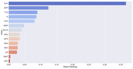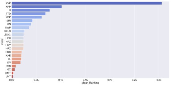 Based on the importance of the follow-up risk identification indicators, we calculate the cumulative contribution rate of the indicators, ranked in descending order of their importance. We then select indicators with a cumulative contribution rate exceeding 85%, while excluding those falling below this threshold. Figure 3 illustrates the ranking of risk identification indicators with and without follow-up, while Figure 4 shows the ranking for different follow-up risk levels. Notably, indicator XVP holds the highest importance, with several other indicators in the remaining blue areas also scoring high, whereas indicators in the orange areas have lower importance.