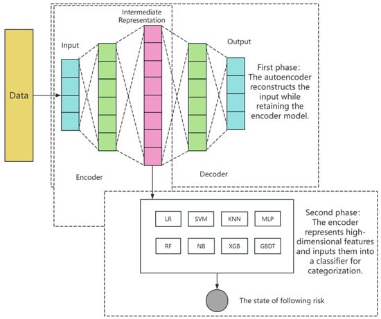 Furthermore, we enhance the autoencoder’s bottleneck layer to capture the deep features of the high-dimensional hidden space. Figure 5 illustrates the integration of the autoencoder with the classification algorithm used in this study.