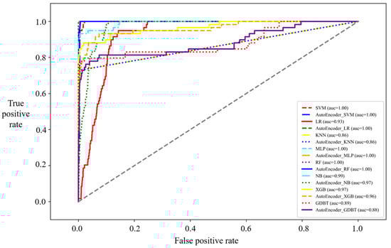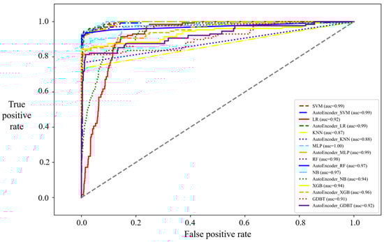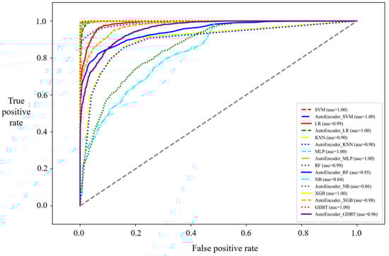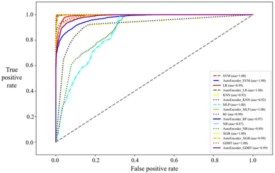 Figure 7 illustrates the ROC curve for different levels of follow-up risk, complemented by the evaluation index data presented in Table 5. The results indicate that validating various levels of follow-up risk is more challenging than distinguishing between the presence or absence of follow-up risk. However, the performance trends among the models are similar to those observed in the risk validation models for follow-up scenarios. The LR model and SVM model stand out as they improve the performance of the validation model on natural driving data. Conversely, the MLP model, NB model, XGB model, and GDBT model show decreased performance. The KNN model and RF model maintain their performance levels. Among the basic validation models, the AutoEncoder_LR model achieves the highest accuracy of 70.14%, surpassing the MLP model’s accuracy of 70.01% by 0.18%. Moreover, the AutoEncoder_LR model accelerates the validation process by 84.15%.