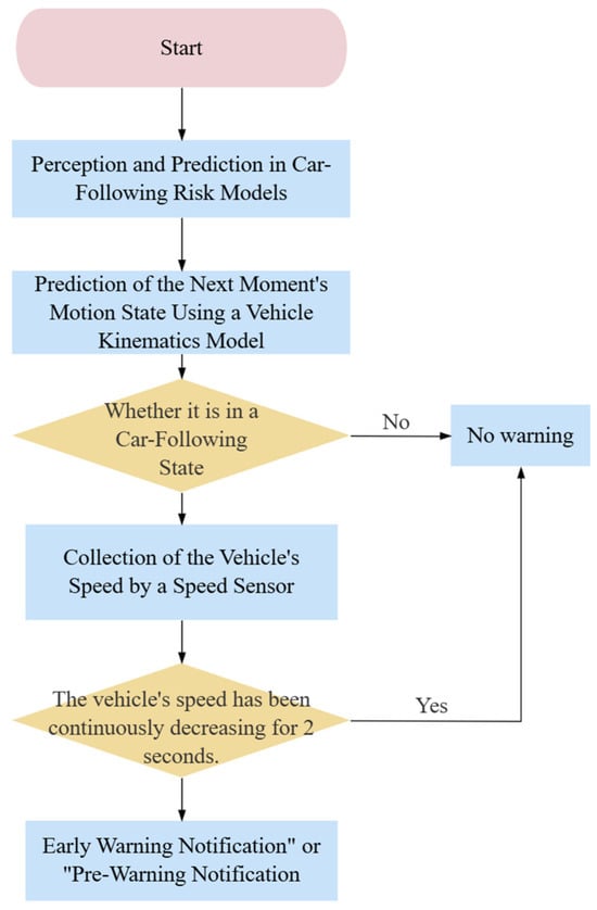 According to Zhu Xichan’s study on the potential risk classification standard in the following state, 2s was used as the safety margin value for dividing the hazard domain. If the speed of the vehicle continues to drop beyond the risk range within 2s, the system will not warn. Figure 14 shows the overall judgment process of the vehicle following state.