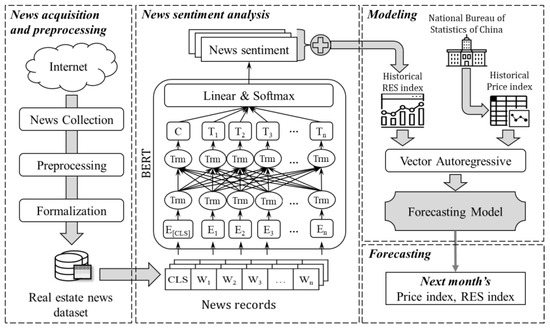 As shown in Figure 1, the proposed real estate price index forecasting scheme consists of 4 modules. In the News acquisition and preprocessing module, we crawl real estate online news for specific cities from the Internet and structure them into a real estate news dataset. In the News sentiment analysis module, we employ the pre-trained BERT model to fine-tune the features of news texts and understand the sentiment expressed in the news. In the Modeling RES index stage, we aggregate the sentiment values of each news record into a monthly RES index series. Then, we use the VAR method to create a forecasting model that can capture the interaction mechanism between the RES index and the price index published by the National Bureau of Statistics of China. In the Forecasting stage, we use this forecasting model to forecast the next monthly real estate price index and RES index.