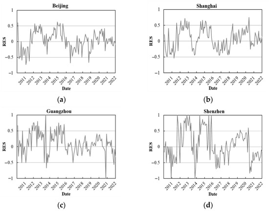 (2) The construction of China’s urban RES index revealed interesting trends. The RES index series of each city exhibited chaos and disorder, lacking obvious periodicity. The statistical features of the RES index differed across cities, with Shenzhen showing more severe fluctuations, Guangzhou having a more optimistic market sentiment, and Beijing and Shanghai being relatively stable.